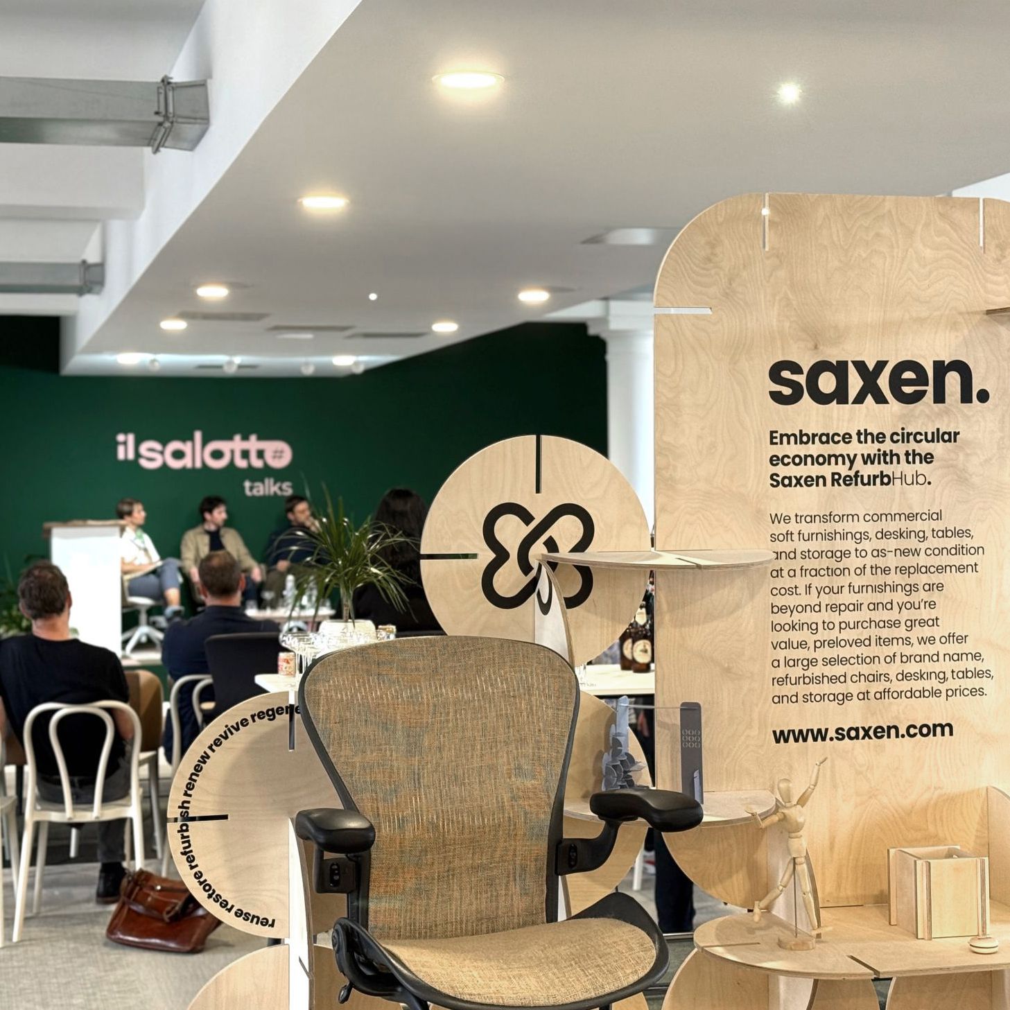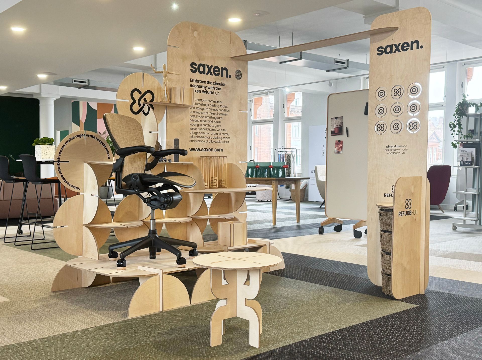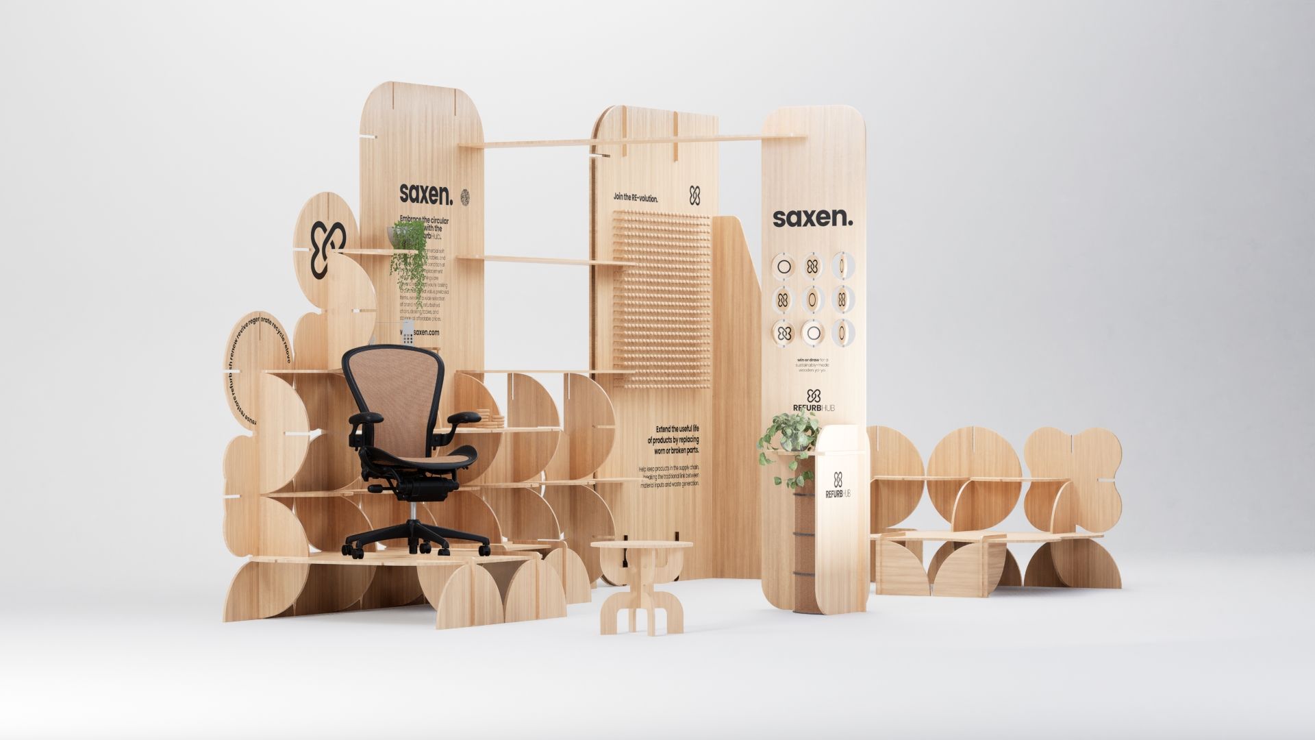 I designed this agile, slot-together stand for Saxen Interiors, initially for a 2 x 2-metre footprint, to promote Saxen’s newly launched RefurbHub. The brief was to showcase the company's products while reflecting a deep commitment to sustainability.